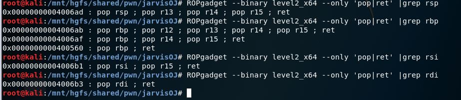 | gdb-peda$ x/5i 0x00000000004006AA => 0x4006aa <__libc_csu_init+90>: pop rbx 0x4006ab <__libc_csu_init+91>: pop rbp 0x4006ac <__libc_csu_init+92>: pop r12 0x4006ae <__libc_csu_init+94>: pop r13 0x4006b0 <__libc_csu_init+96>: pop r14 gdb-peda$ x/5i 0x00000000004006AA+3 0x4006ad <__libc_csu_init+93>: pop rsp ##rsp 0x4006ae <__libc_csu_init+94>: pop r13 0x4006b0 <__libc_csu_init+96>: pop r14 0x4006b2 <__libc_csu_init+98>: pop r15 0x4006b4 <__libc_csu_init+100>: ret gdb-peda$ x/5i 0x00000000004006AA+5 0x4006af <__libc_csu_init+95>: pop rbp ##rbp 0x4006b0 <__libc_csu_init+96>: pop r14 0x4006b2 <__libc_csu_init+98>: pop r15 0x4006b4 <__libc_csu_init+100>: ret 0x4006b5: data16 nop WORD PTR cs:[rax+rax*1+0x0] gdb-peda$ x/5i 0x00000000004006AA+7 0x4006b1 <__libc_csu_init+97>: pop rsi ##rsi 0x4006b2 <__libc_csu_init+98>: pop r15 0x4006b4 <__libc_csu_init+100>: ret 0x4006b5: data16 nop WORD PTR cs:[rax+rax*1+0x0] 0x4006c0 <__libc_csu_fini>: repz ret gdb-peda$ x/5i 0x00000000004006AA+9 0x4006b3 <__libc_csu_init+99>: pop rdi ##rdi 0x4006b4 <__libc_csu_init+100>: ret 0x4006b5: data16 nop WORD PTR cs:[rax+rax*1+0x0] 0x4006c0 <__libc_csu_fini>: repz ret 0x4006c2: add BYTE PTR [rax],al