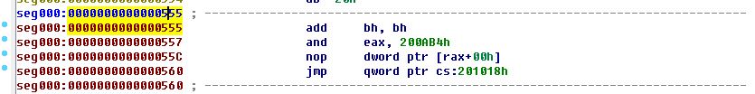 生成的文件code1用ida的binary形式打开,找到偏移为0x555处,按c查看汇编代码