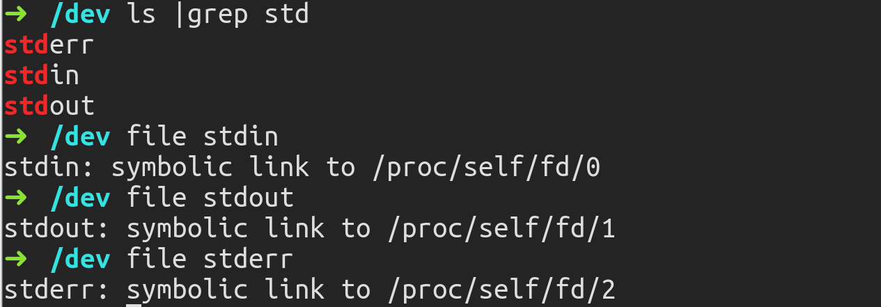 | 标准输入 即STDIN , 在 /dev/stdin , 一般指键盘输入, shell里代号是 0 标准输出 即STDOUT, 在 /dev/stdout, 一般指终端(terminal), 就是显示器, shell里代号是 1 标准错误 即STDERR, 在 /dev/stderr, 也是指终端(terminal), 不同的是, shell里代号是 2