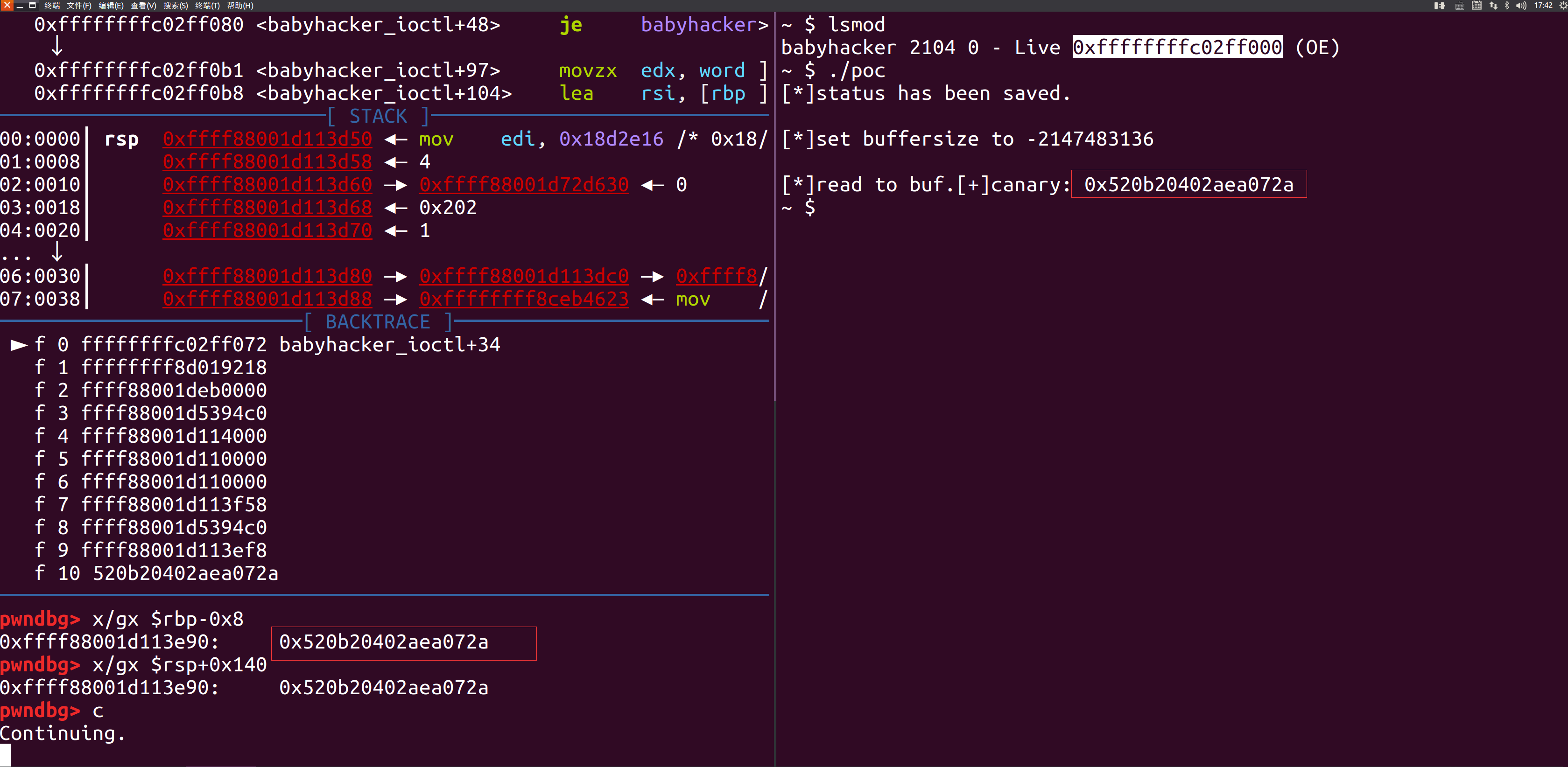 1 2 3 4 5 6 7 8 9 10 11 12 13 14 15 16 ➜ babyhacker gdb ./vmlinux -q pwndbg: loaded 181 commands. Type pwndbg [filter] for a list. pwndbg: created $rebase, $ida gdb functions (can be used with prin) Reading symbols from ./vmlinux...(no debugging symbols found)...do. pwndbg> add-symbol-file babyhacker.ko 0xffffffffc02ff000 add symbol table from file "babyhacker.ko" at .text_addr = 0xffffffffc0093000 Reading symbols from babyhacker.ko...done. pwndbg> b *0xffffffffc02ff000+0x50 Breakpoint 1 at 0xffffffffc0093050: file /home/zoe/Desktop/kernel_. pwndbg> target remote :1234 Remote debugging using :1234 0xffffffff8e263656 in ?? () ... pwndbg> c Continuing.