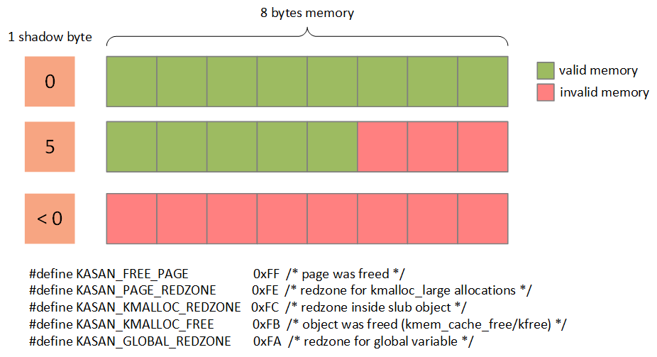 KASAN: Kernel Address Sanitizer 的缩写,它是一个动态检测内存错误的工具,主要功能是检查内存越界访问和使用已释放的内存等问题。KASAN可以检测的内存异常包括:slab-out-of-bounds/user-after-free/stack-out-of-bounds/global-out-of-bounds等。基于影子内存(shadow memory)和红色区域(red zones)